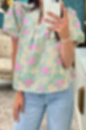 Green Short Bubble Sleeve Summer Floral Blouse