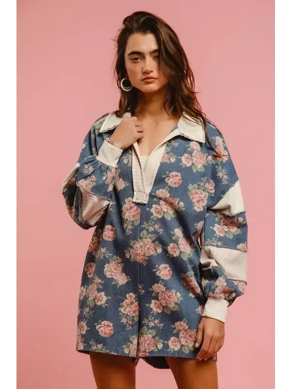 Pink Round Neck Textured Contrast Floral Bubble Sleeve Blouse