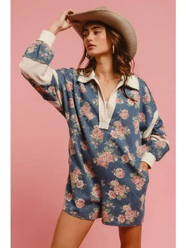 Beau Blue Floral Print Elastic Waist Pull On Casual Jeans