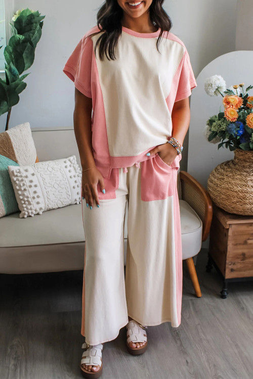 White Two-tone Color Block Patchwork Tee Drawstring Loose Pant Set