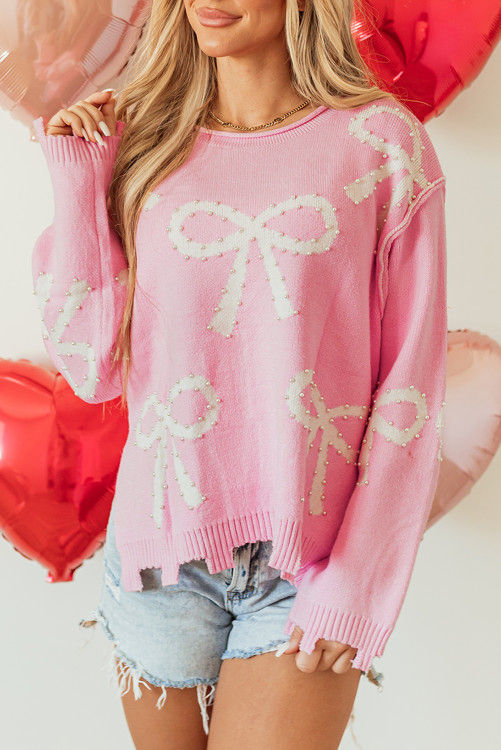 Pink Pearl Beaded Bowknot Pattern Distressed Split Hem Sweater